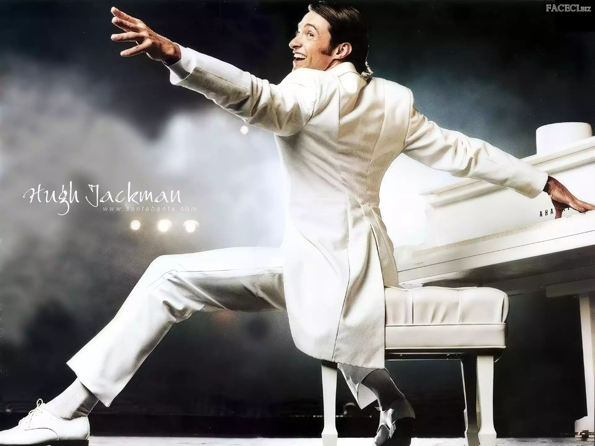 fortepian, Hugh Jackman, biały strój - faceci.biz
